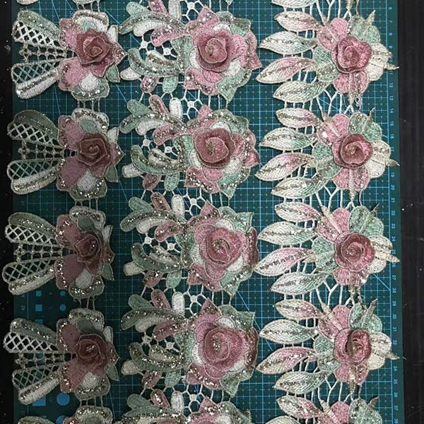 LB® er en storskala produsent av 3d-blomster-polyestertrim. Disse 3d-blomster-polyestertrimmene er de siste designene av høykvalitets blonder. 3D-blomsten polyester-kanten er laget av kjemikalier, den kan brukes i klær, vesker og hjemmetekstilprodukter.
