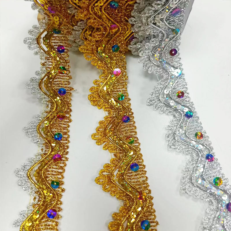 Klærtilbehør Gull og sølv metallisk grense blonder trim flerfarget paljett Gulltråd Metallisk blonder Trim dekorert med gull og sølv bikolorede metallledninger og syvfargede paljetter, det skaper en fantastisk og blendende kantingseffekt. Det er egnet for dekorasjon av mansjetter, krager og hems av high-end klær som kveldskjoler, scenekostymer og brudekjoler. Materialet er lett og fleksibelt, falmer ikke eller piller, og støtter tilpasset bredde og mønstre, og gir en luksuriøs glans til klærne.