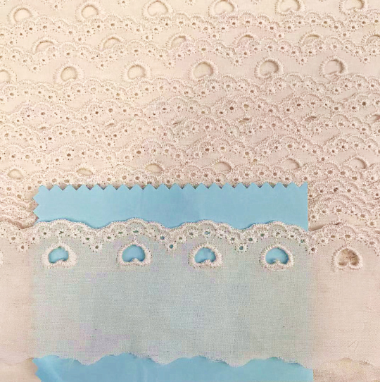 Hvit floret bomull med bølgete kanter blonder trim laget av ren bomull, den har tredimensjonale små blomster med bølgete kanter, noe som gjør den myk, pustende og naturlig retro. Det er egnet for dekorasjon av barneklær, kvinneklær, husholdningsartikler osv. Det er miljøvennlig og hudvennlig, maskinvaskbar og tilbyr flere breddealternativer. Tilpasning støttes.