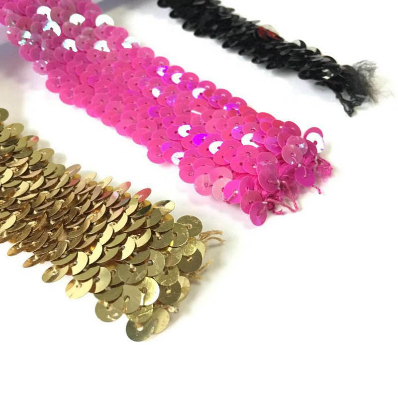 Different bredde bling finish flette elastisk paljett blonder trim tilgjengelig i flere bredder, den har en elastisk base sammenkoblet med skinnende paljetter, og gir den en strålende glans. Det er egnet for scenekostymer, kveldskjoler og sko- og hatdekorasjoner